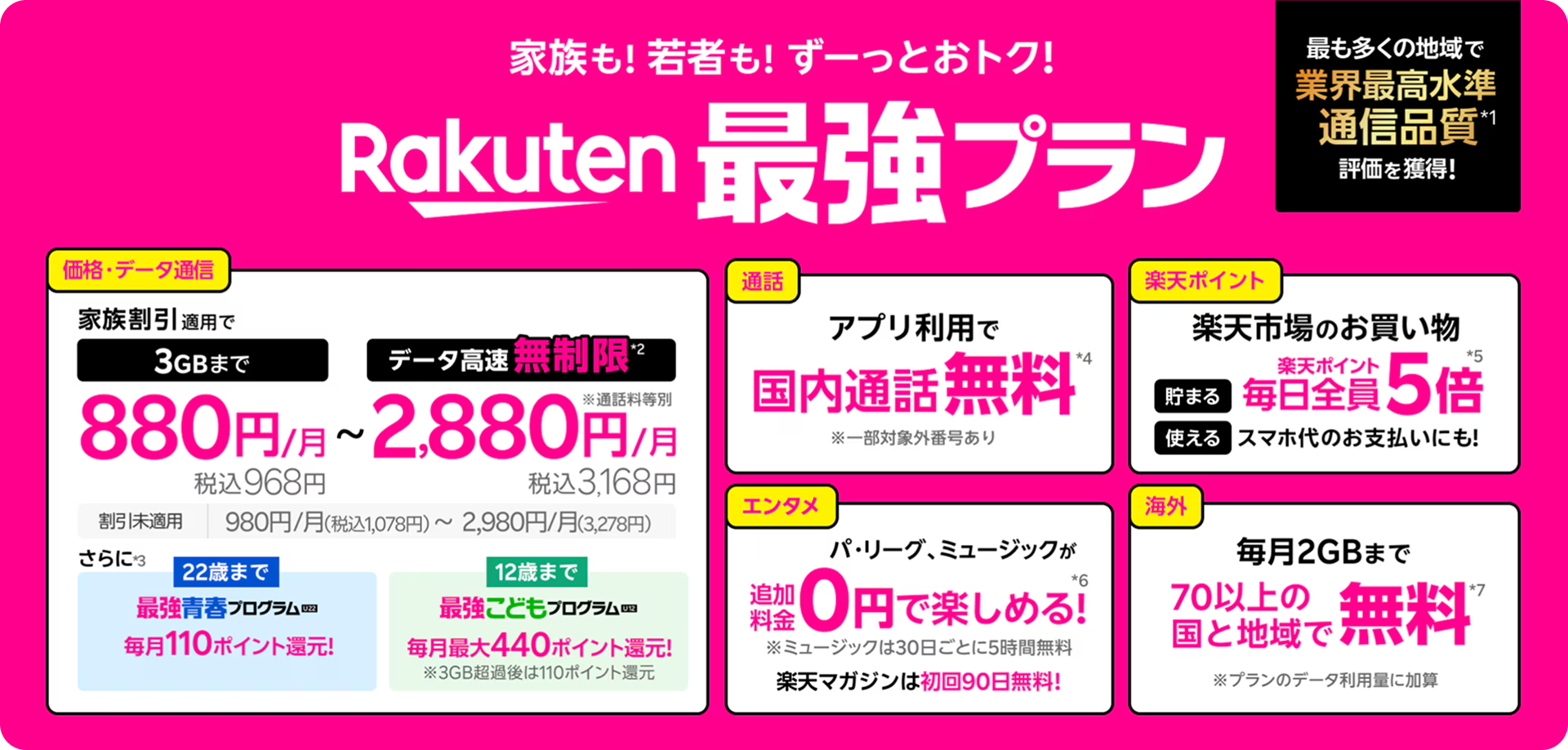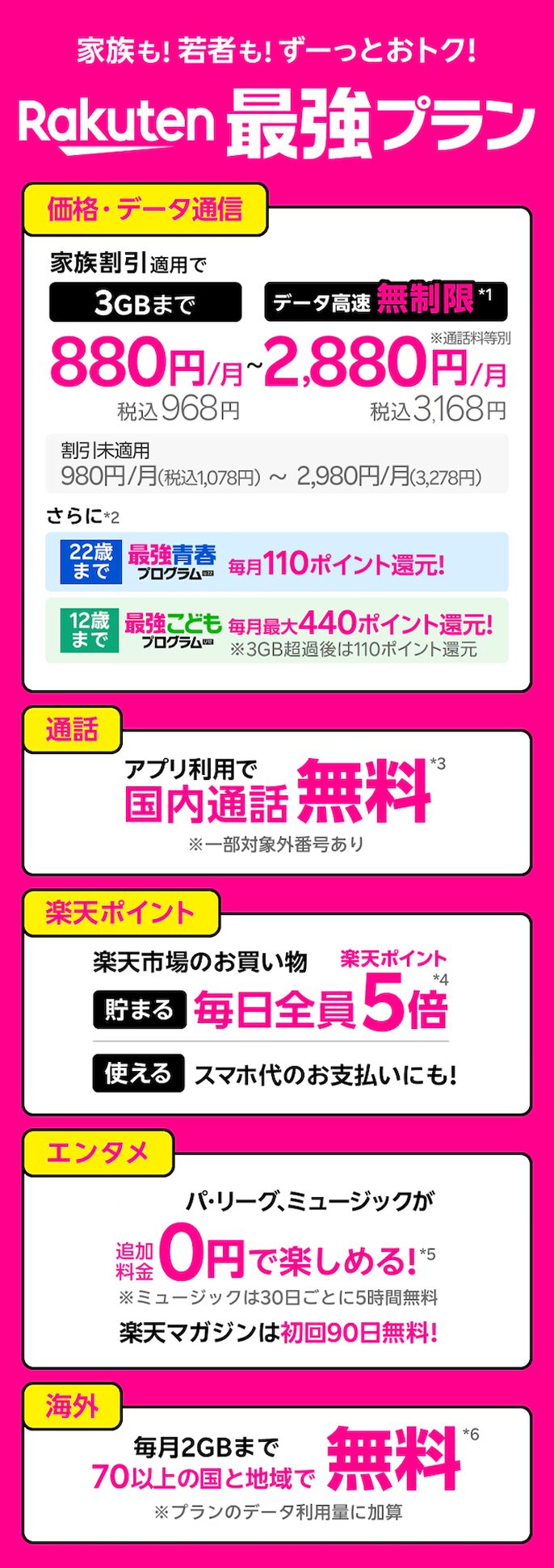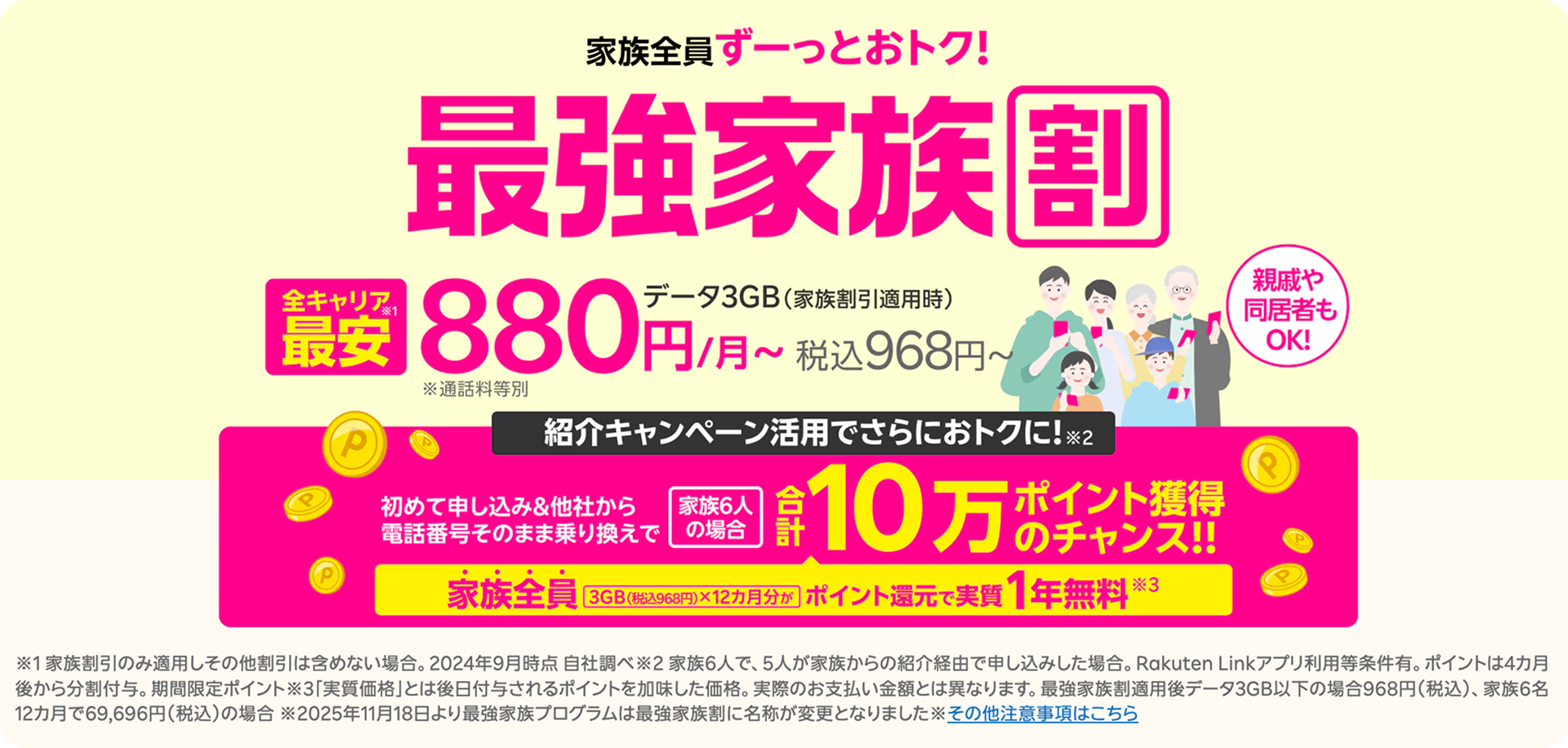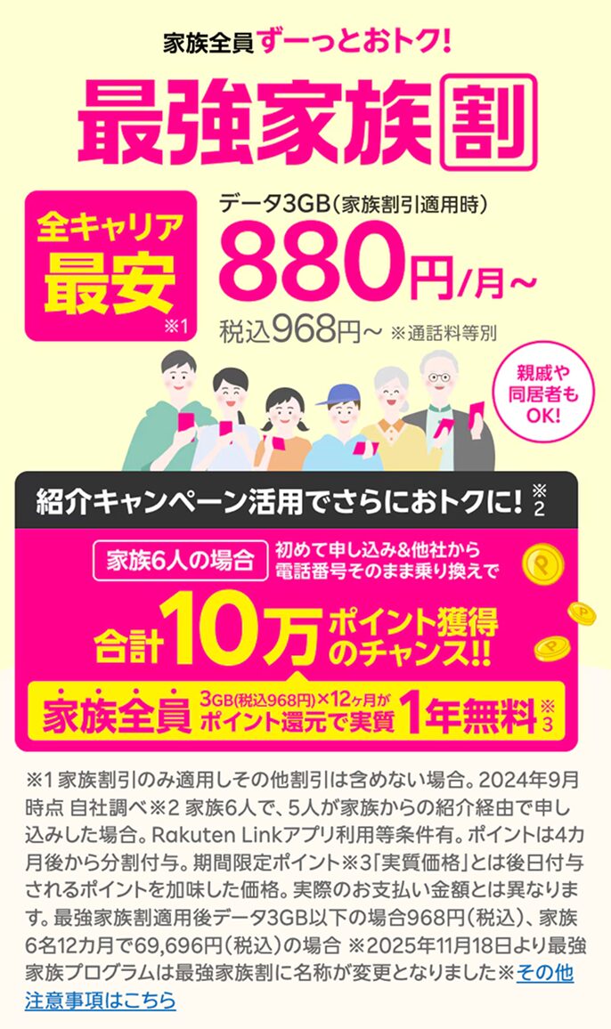 Rakuten最強家族割では、全キャリア最安のデータ3GBで月額880円(税込968円)〜に!親戚や同居人もOK! 紹介キャンペーン活用でさらにおトクになります!初めてのお申し込み&他社から電話番号そのまま乗り換えで、家族6人の場合合計10万ポイント獲得のチャンス!家族全員がポイント還元で実質1年無料になります◎