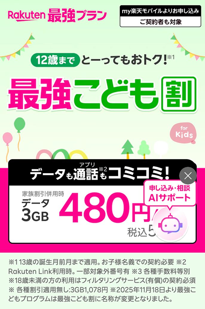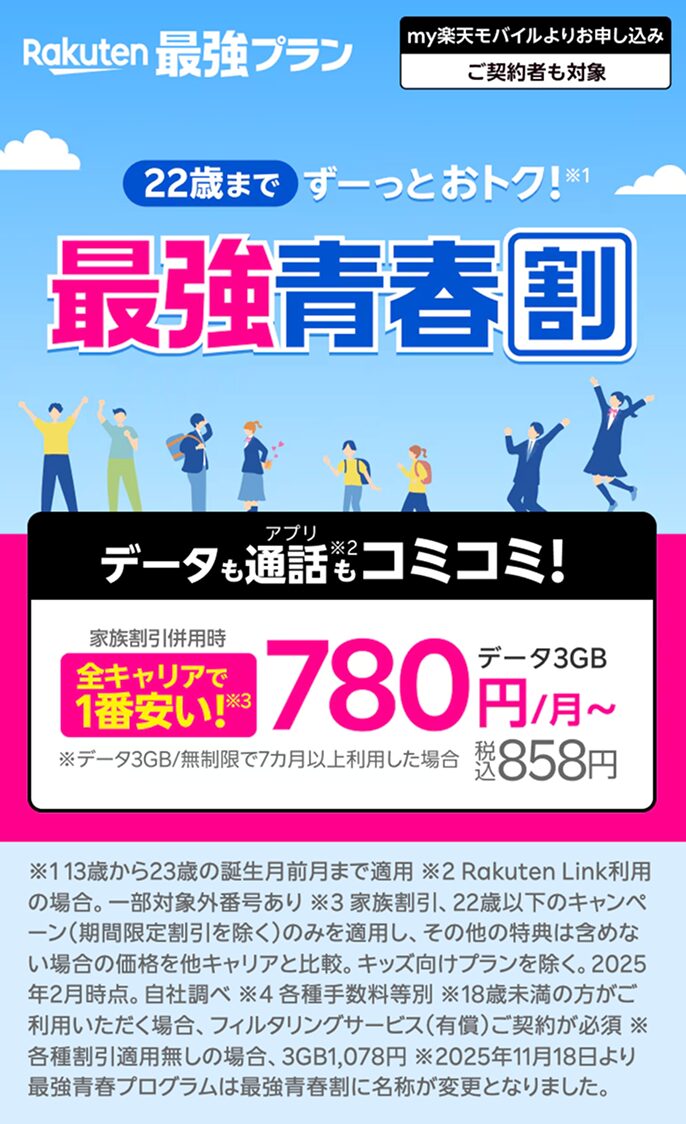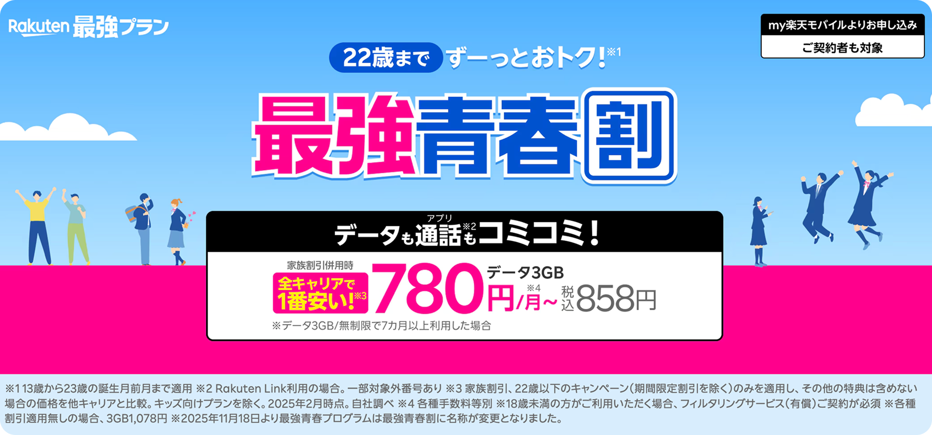 Rakuten最強青春割では、家族割引適用で毎月110円引きされ、全キャリアで一番安い、データ3GBで実質月額780円(税込858円)〜となります!22歳まではずっと適用されるプログラムなので、お子さまの初スマホのプランとしておすすめです。