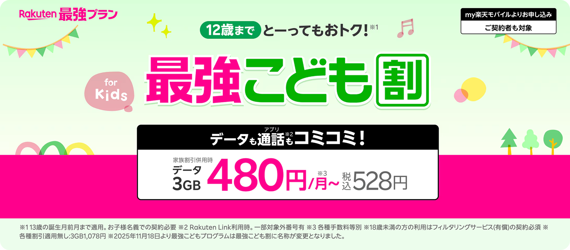 Rakuten最強子ども割では、家族割引適用での毎月の440ポイント還元で、データ3GBを月額実質480円(税込528円)〜使用できます!12歳までずっと適用◎オンライン学習などでよくスマホを利用するお子さまにおすすめです!